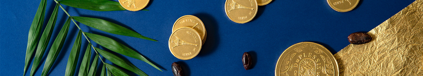 Remplacez les traditionnelles dragées de vos célébrations par un trésor gourmand en offrant à vos invités des pièces souvenir en chocolat.